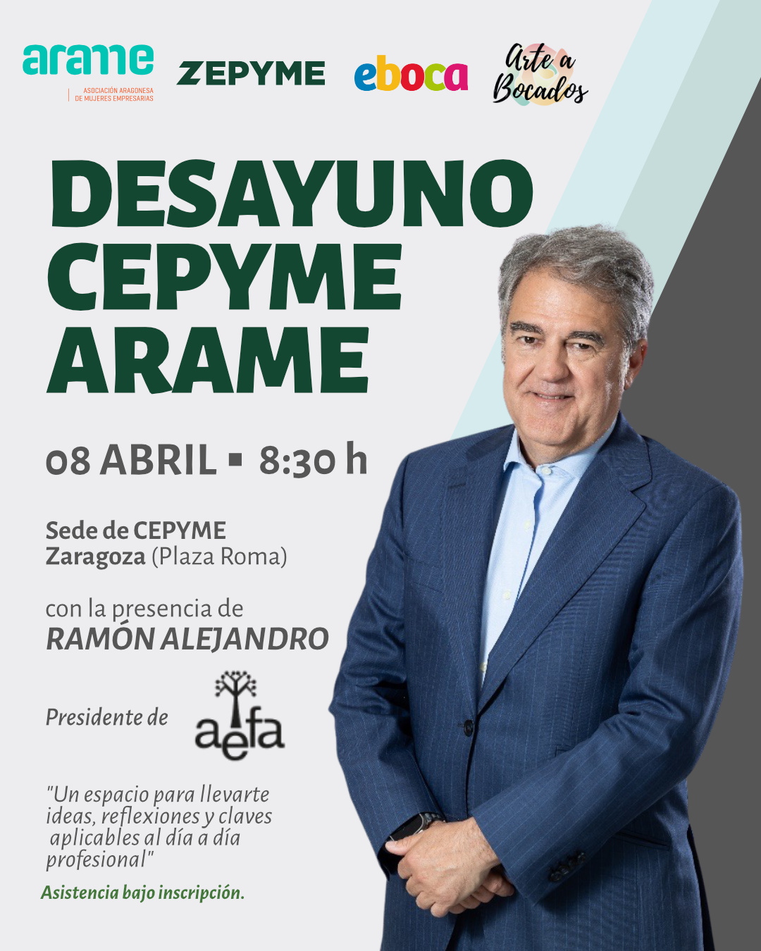 ARAME celebrará un nuevo desayuno en colaboración con CEPYME Zaragoza, una cita que contará en esta ocasión con la participación de Ramón Alejandro, presidente de la Asociación de la Empresa Familiar de Aragón (AEFA). Será el 8 de abril a las 8:30 de la mañana en la sede de ZEPYME. Una vez más el evento cuenta con el patrocinio de EBOCA y de ARTE Bocados.